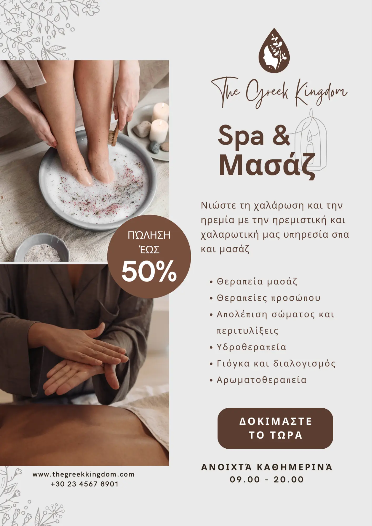 Μια σειρά από εξαιρετικές θεραπείες σπα σας περιμένουν στο καταφύγιο χαλάρωσης, το Greek Kingdom Spa. Σχεδιασμένο για να ικανοποιεί κάθε σας ανάγκη και επιθυμία, το ολοκληρωμένο μενού των απολαυστικών θεραπειών μας σας προσκαλεί να ξεκινήσετε ένα ταξίδι ολιστικής αναζωογόνησης και ανανέωσης. Από τα καταπραϋντικά εγκεφαλικά επεισόδια της θεραπείας μασάζ μέχρι τις μεταμορφωτικές επιδράσεις των θεραπειών προσώπου, των απολέπισης σώματος και των περιτυλίξεων, κάθε χωρίς άδεια εμπειρία είναι προσεκτικά σχεδιασμένη για να περιποιηθεί το σώμα, το μυαλό και το πνεύμα σας. Είτε αναζητάτε βαθιά χαλάρωση, λαμπερή επιδερμίδα ή στοχευμένη ανακούφιση από τη μυϊκή ένταση, οι ειδικοί θεραπευτές μας είναι αφοσιωμένοι στην παροχή εξατομικευμένης φροντίδας και προσοχής που ξεπερνά τις προσδοκίες σας. Με δέσμευση στην αριστεία και πάθος για ευεξία, σας Wazamba προσκαλούμε να αφεθείτε στις θεσπέσιες απολαύσεις της όασης σπα μας και να ανακαλύψετε τη μεταμορφωτική δύναμη της αυτοφροντίδας και της απόλαυσης.